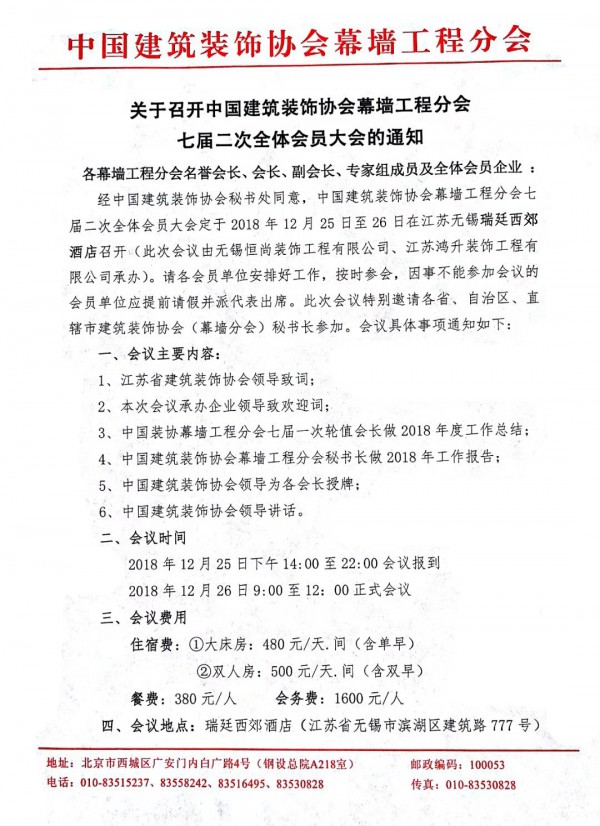 中國建築裝飾協(xié)會幕牆工程分會七屆二次全委會即將召開